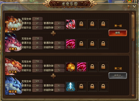 每一組龍寵都有一個組合的技能,並且越往後的龍寵比前面的龍寵屬性和技能都更優秀。玩家替換龍寵的時候需要一組一組的替換。每個龍寵都能給玩家帶來強大的屬性加成,並且在戰鬥中會提供戰鬥技能。