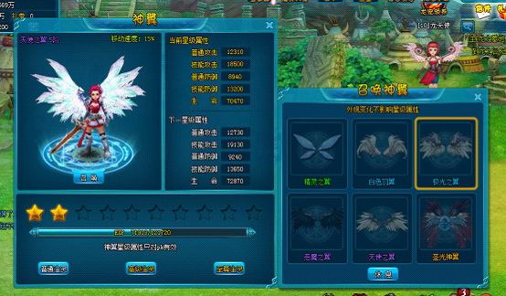 人物達到一定等級後開放神翼,神翼不但提高了絢麗的形象,還提供了強力的屬性加成。神翼一共六階,每一階對應一個神翼形象。每一階分 10 星,當提升到 10 星後才允許升階,星級每次提升後都可額外增加屬性。